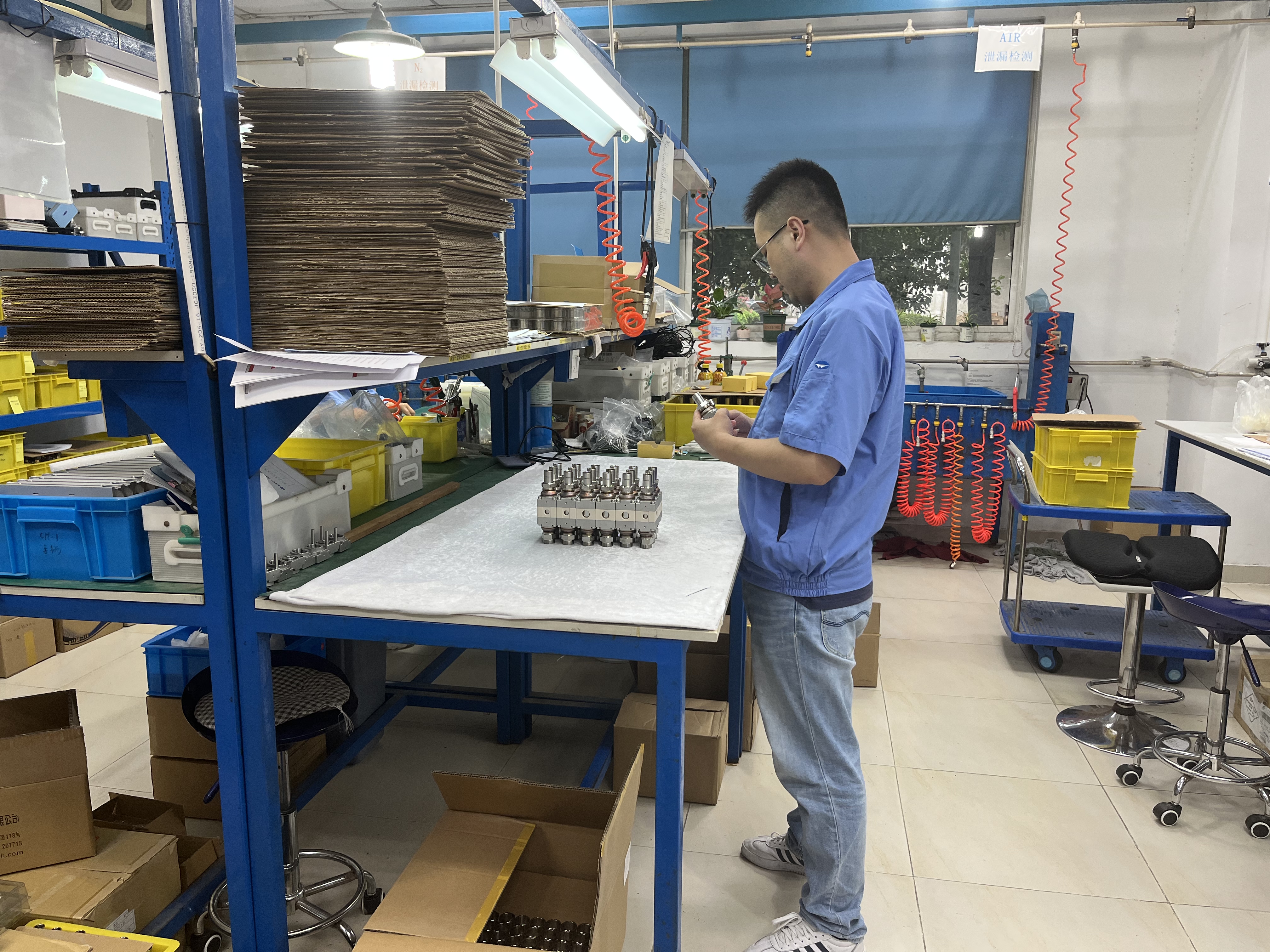 該部門生產(chǎn)由工程師設(shè)計(jì)的產(chǎn)品。從貨架上拿取零件,將它們組合起來(lái),然后參照手冊(cè)組裝產(chǎn)品。制作完成后,檢查是否有漏水等問(wèn)題。因?yàn)槭蔷軆x器,每一個(gè)都是手工制作的,所以我們進(jìn)行了機(jī)器難以進(jìn)行的微調(diào),并目視檢查是否有小劃痕。